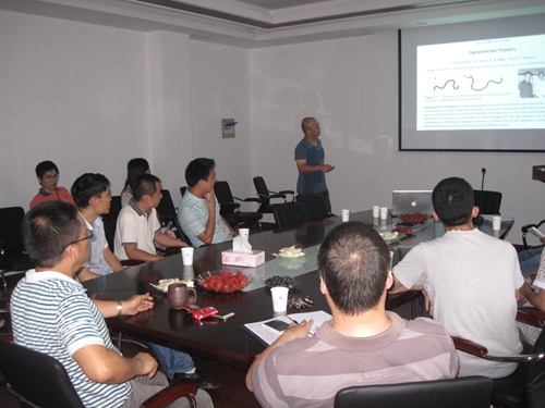 6月24日,美国康涅狄格州立大学教授、绅士动漫 鉴湖学者讲座教授林遥来浙江省精细化学品传统工艺替代技术研究重点实验室做了题为《Recent advances in supramolecular polymer and materials》的专题报告,林遥教授从超分子结构-反应机理-应用方面等不同层面向大家展示了超分子的优势以及最新的研究进展,学术报告后,如何将高分子材料和超分子材料结合起来解决现有的工业问题引起了大家的热议。