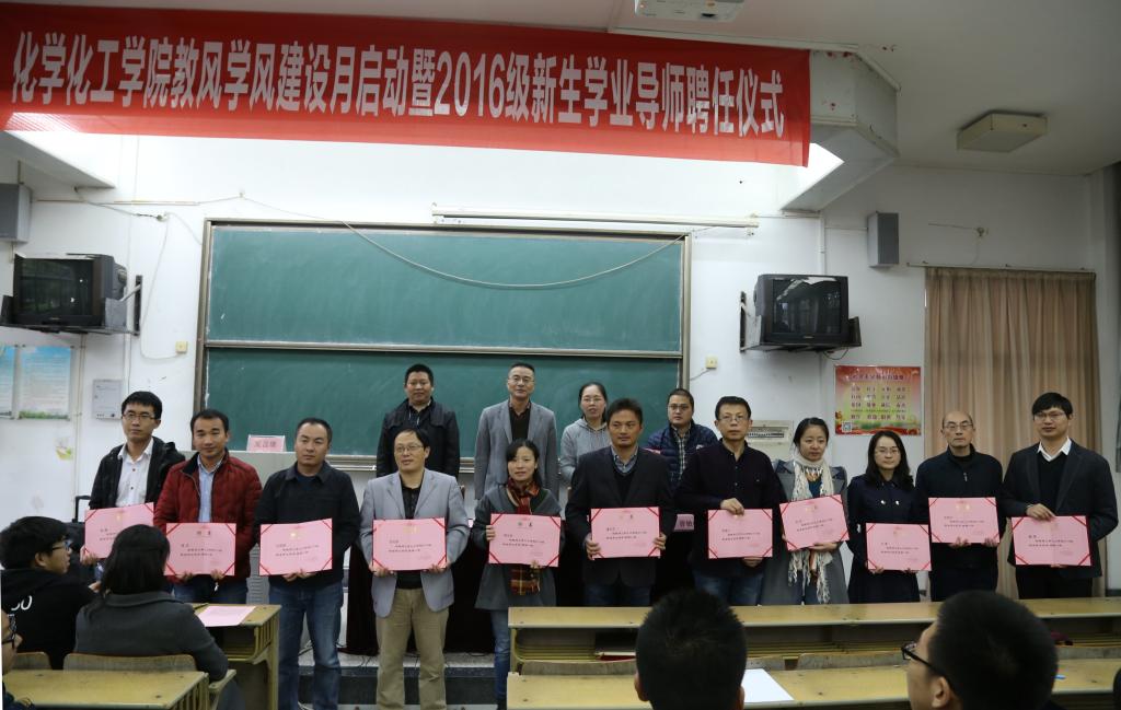 本科新生学业导师的通知》,并分别为2015-2016学年优秀学业导师和2016级新生学业导师颁发了荣誉证书和聘书。聘任仪式结束后,15级老生代表应化151班王志豪同学和16级新生代表化学师范161班胡宁洋同学发言,他们分享了教风学风建设月活动的开展、学业导师制度的实施给同学们带来的帮助,并且呼吁同学们要持之以恒,同时也预祝“教风学风建设月”活动圆满成功。接着2015年优秀学业导师、16级新生学业导师代表郦勇老师发言,他用精炼的语言阐述了他所理解的学业导师,并期待和同学们一起探寻神奇的化学世界。