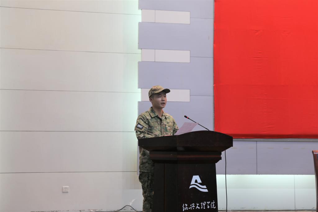 退伍学生代表高分子151黄伟炎进行了主题发言,跟同学们分享对军训意义的理解:军训能够培养纪律意识;军训能够提高标准意识;军训能够激起集体荣誉感。参训学生代表樊少康代表全体同学表示:会以军人的标准严格要求自己,在军训过程中做到“流血流汗不流泪、再苦再累不掉队”。