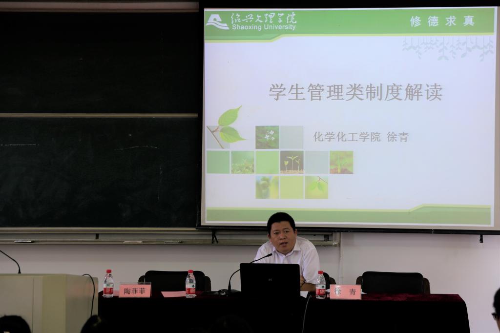 徐青副书记全面细致地讲解了学生管理类制度,重点强调了奖惩制度、宿舍安全卫生、学生请假制度、大型活动报批制度等。与新生漫谈了大学生活与文明修身,以及文明寝室创建工作。最后,对新生提出了希望和要求:1.目标明确,自主学习;2.学会做人,学会生活;3.讲规矩,守底线。