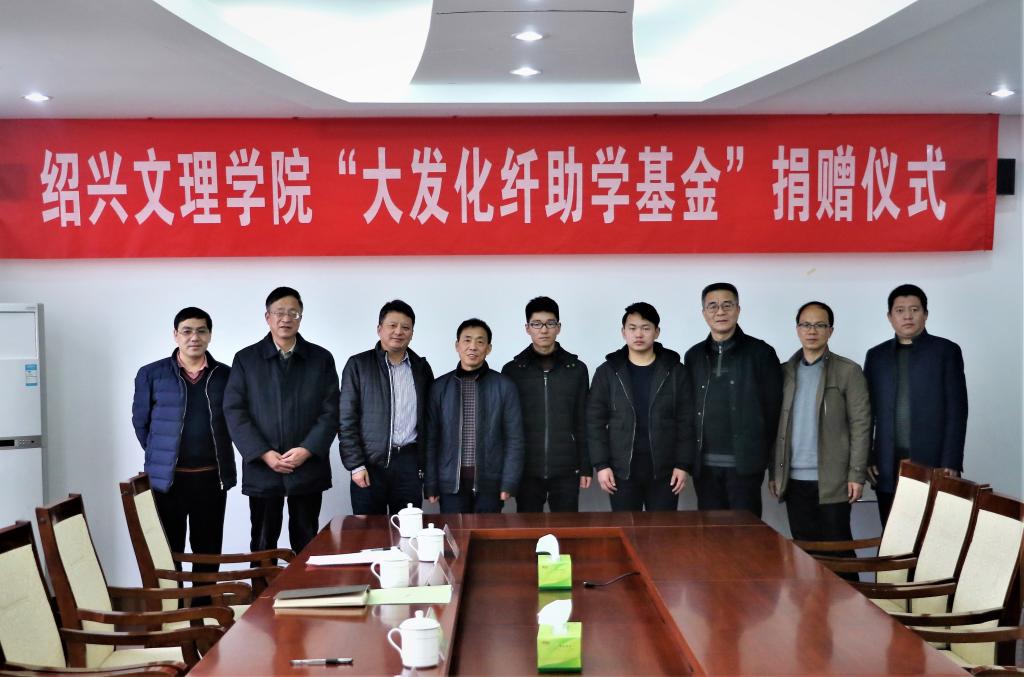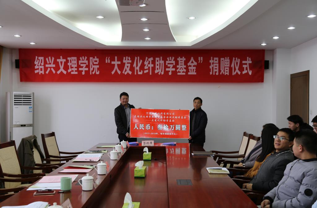 12月13日下午,“大发化纤助学基金”捐赠仪式在行政楼五楼会议室举行。宁波大发化纤有限公司副总经理、数学80届钱军校友与校党委副书记沈赤签订捐赠协议。沈赤接受捐赠并向钱军校友颁发捐赠证书。钱军校友代表宁波大发化纤有限公司向学校基金会捐赠30万元设立“大发化纤助学基金”。校友总会会长宋培基,对外联络处、学工部、绅士动漫