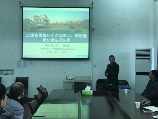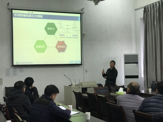 作题为“过渡金属催化不对称氢化、碳氢键活化反应及应用”的学术报告。学院部分教师、硕士研究生、本科生到场聆听了报告。