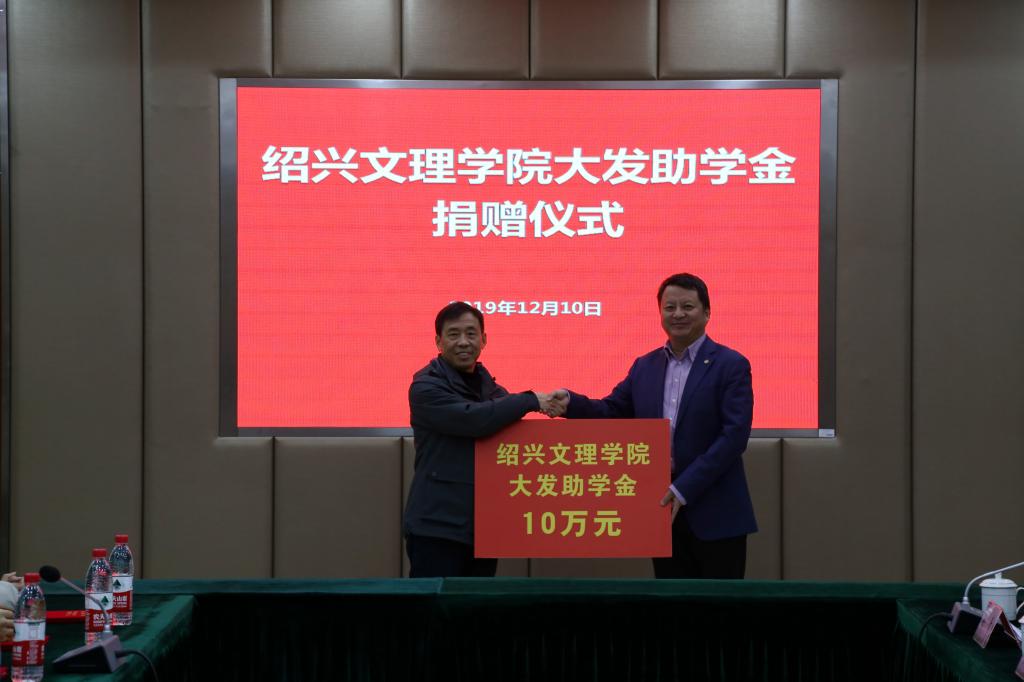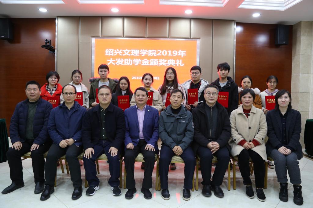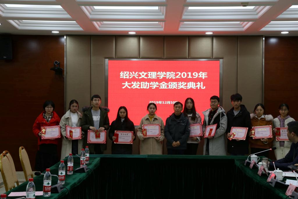 12月10日上午,2019年“大发助学金”颁奖典礼在铁城科教馆一楼会议室举行。校党委副书记沈赤,宁波大发化纤有限公司副总经理钱军先生,学工部、对外联络处、绅士动漫