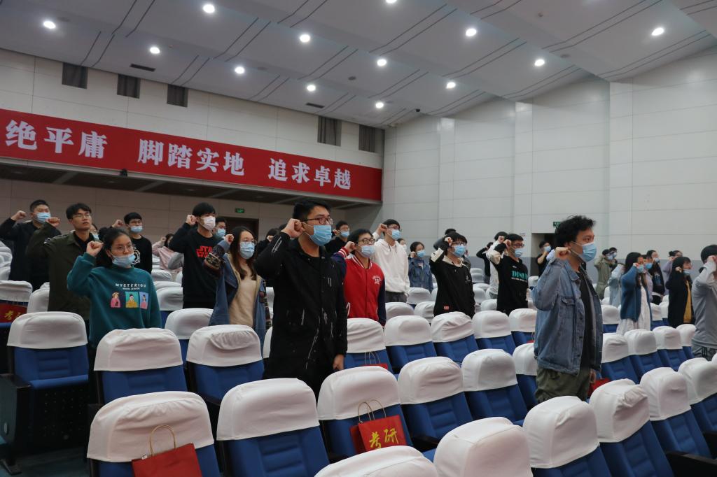 在铁城科教馆报告厅隆重举行2021年考研(博)誓师大会。学院党委书记魏佩敏,执行院长曾敏峰,党委副书记徐青,副院长陶菲菲,校心理健康中心主任徐浩,考研指导教师代表,学生科相关老师,2位考博学生和105名报名了2021年考研的学生参加了大会。