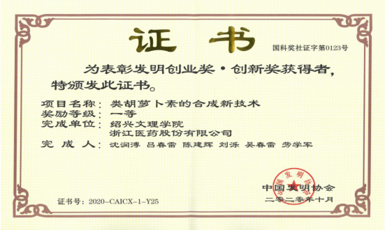 沈润溥教授领衔的类胡萝卜素的合成新技术项目获中国发明协会颁发的全国“发明创新奖”一等奖。