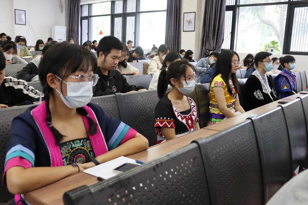 10余名少数民族学生身着民族服装收看开幕会