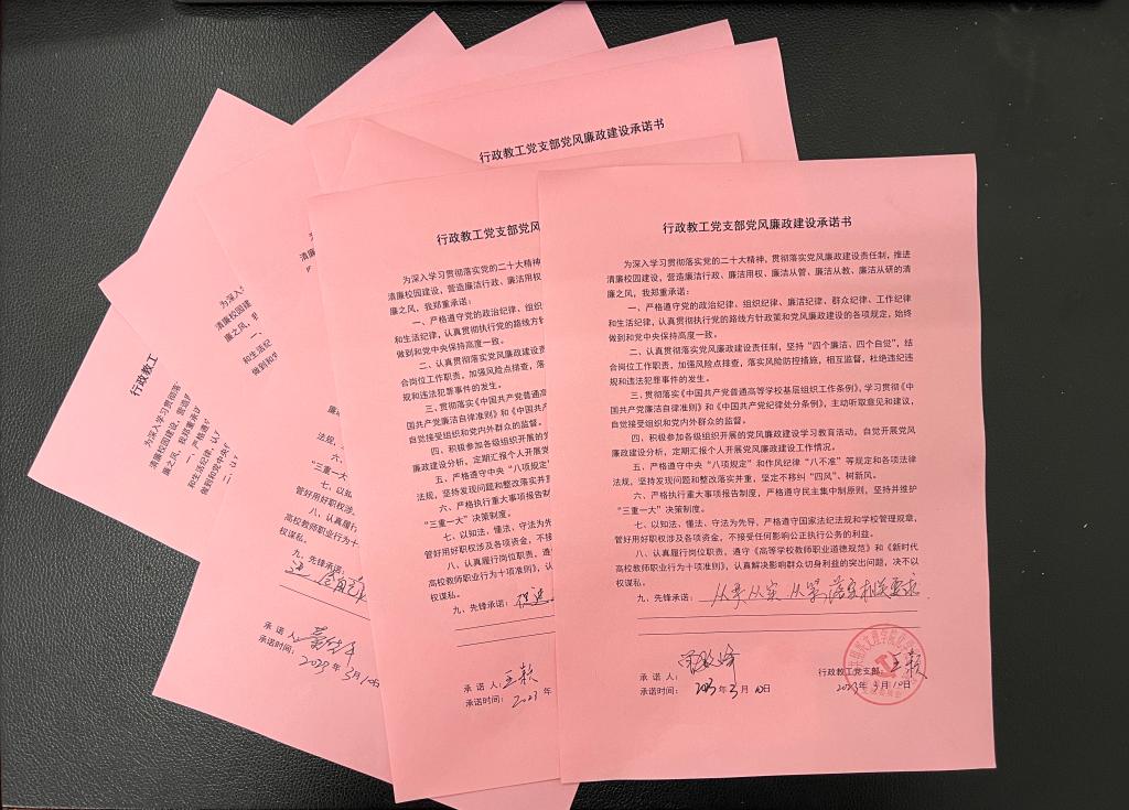 学院党风廉政建设承诺书》,深入贯彻落实党风廉政建设责任制,推进清廉学院建设。教师党员也纷纷开展先锋承诺,“亮身份、当先锋、作表率”,发挥先锋模范作用。学生党员自觉进行“党员寝室”挂牌活动,充分展示青年党员的先锋带头作用,进一步增强责任担当。