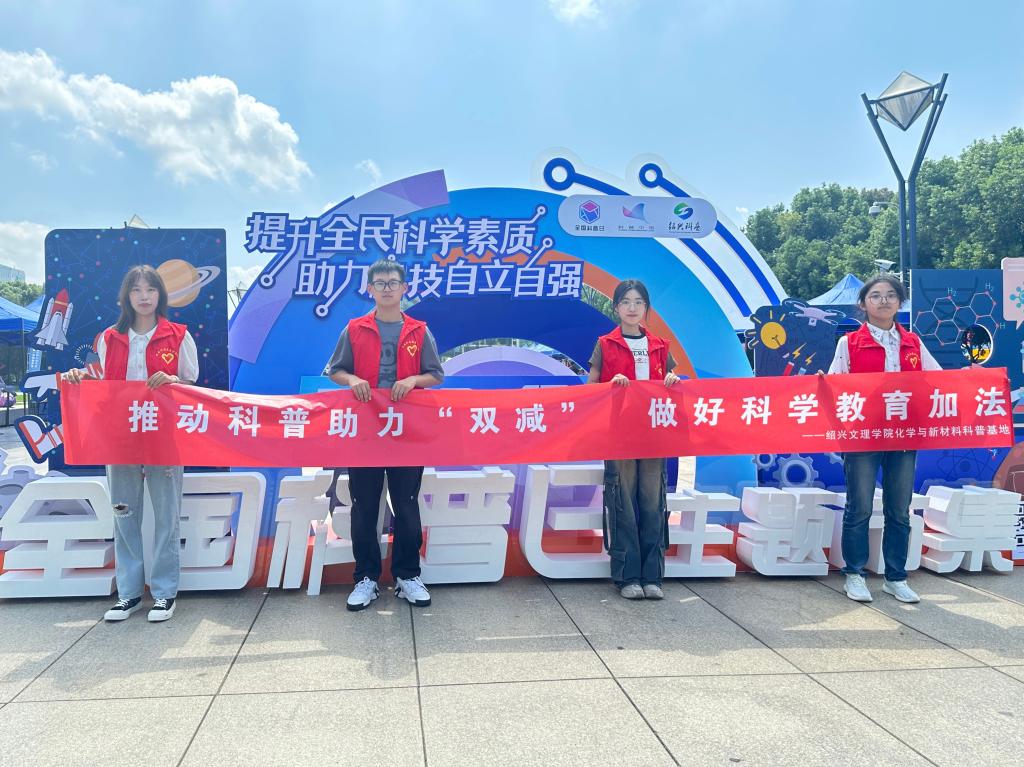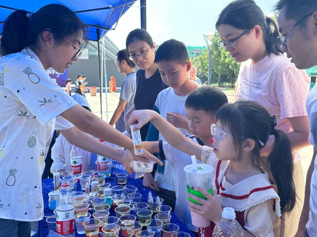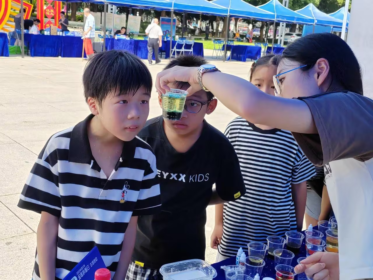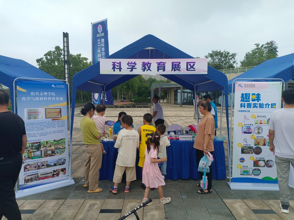 化学与新材料科普基地志愿者,在2023年绍兴市全国科普日主题市集活动和越城区全国科普日暨科普助力亚运系列活动启动仪式,开展了光的形状、海中花园、掌中红绿灯、非牛顿流体、水中龙卷风和彩红雨等趣味化学实验。