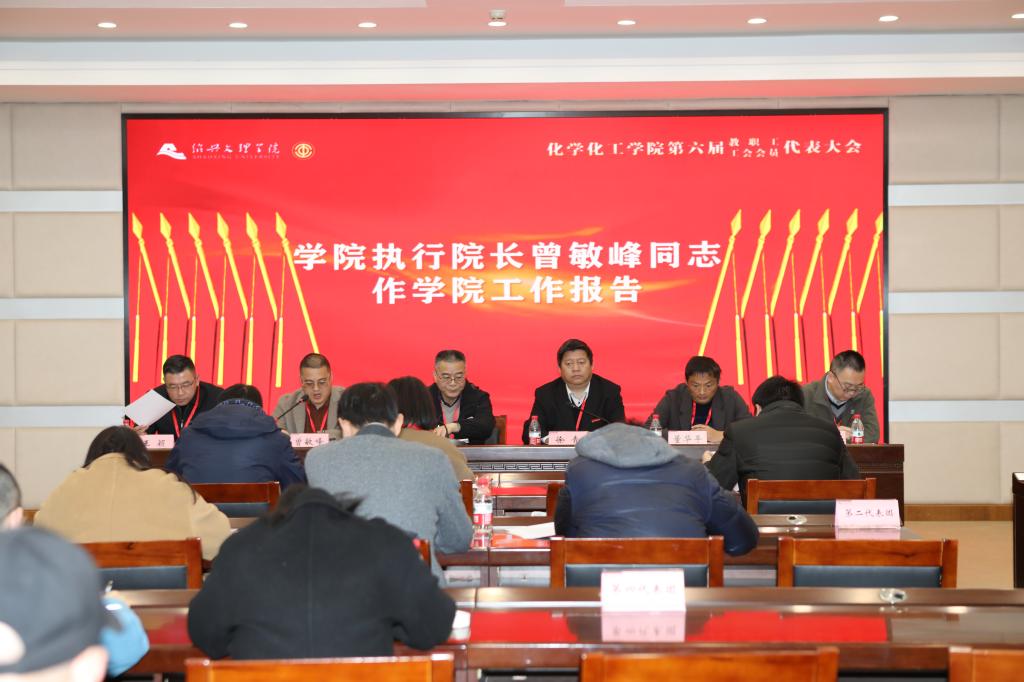 曾敏峰作学院工作报告,他回顾总结了2023年学院各项事业发展所取得的成绩,报告了学院在人才培养、师资队伍建设、校企合作、教学科研和社会服务等方面的工作成效,分析了当前化学一流学科建设和博士点创建面临的新形势与新任务及问题短板,明确了学院下一阶段的重点工作思路和主要措施。