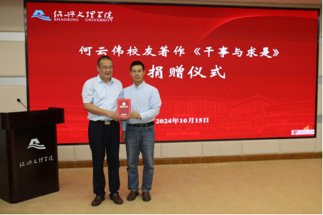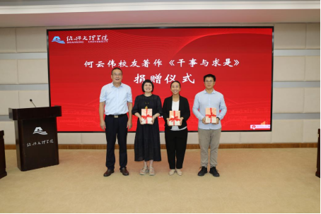 捐赠《干事与求是》图书。图书馆馆长李秀明向何云伟校友颁发收藏证书。