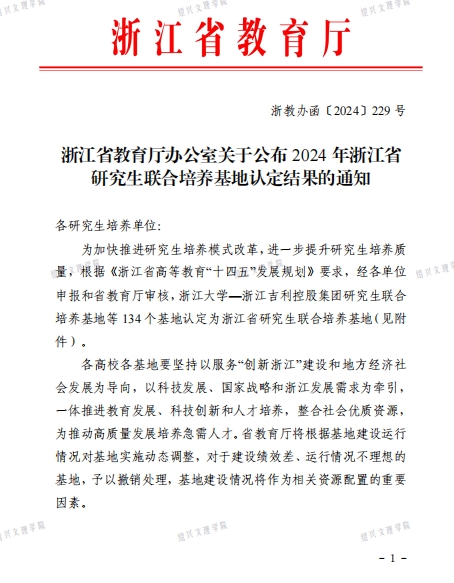 —浙江医药股份有限公司研究生联合培养基地”成功获批2024年浙江省研究生联合培养基地。