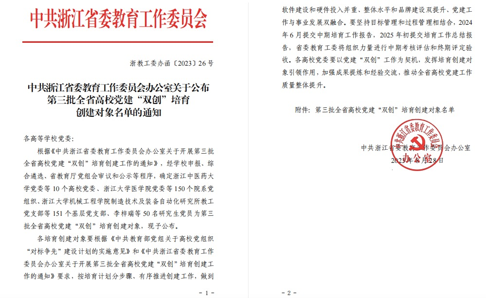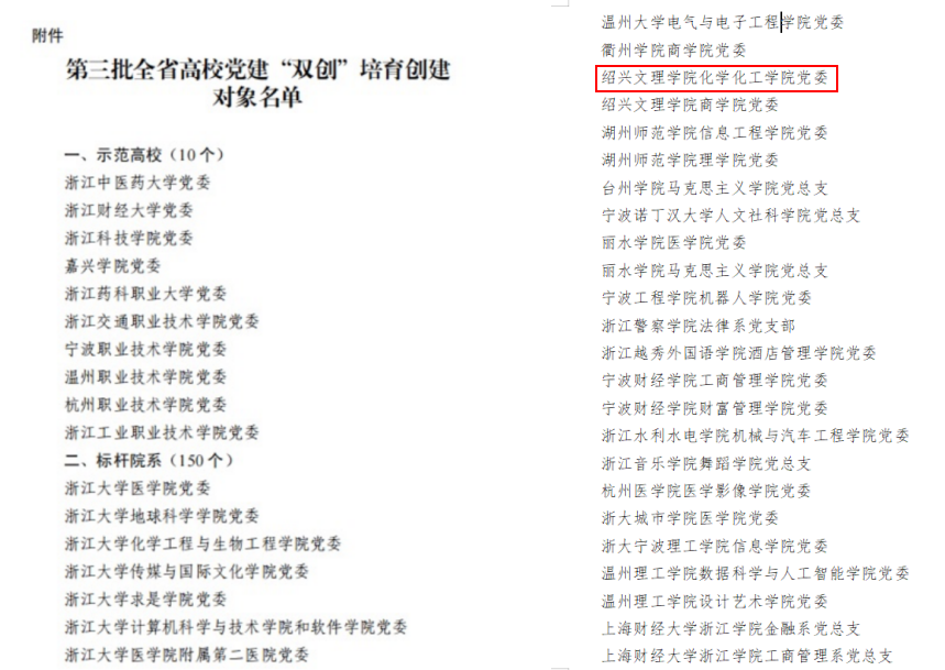 近日,中共浙江省委教育工作委员会办公室公布了第三批全省高校党�“双创”培育创建对象名单�绍兴文理学院化学化工学院党委入选省高校第三批标杆院系培育创建对象�