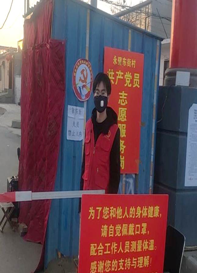 化学化工学院19级无机化学专业研究生郭森,他响应组织号召,参加抗击新冠肺炎志愿服务队,在村里唯一的出入口进行本地人员进出登记以及外来人员劝返等工作。他说:“村委工作人员和我们志愿者一起在这里守护全村人民的健康,全天24小时不间断执勤。在特殊时期,作为共青团员,向党看齐是我对自己的要求。�