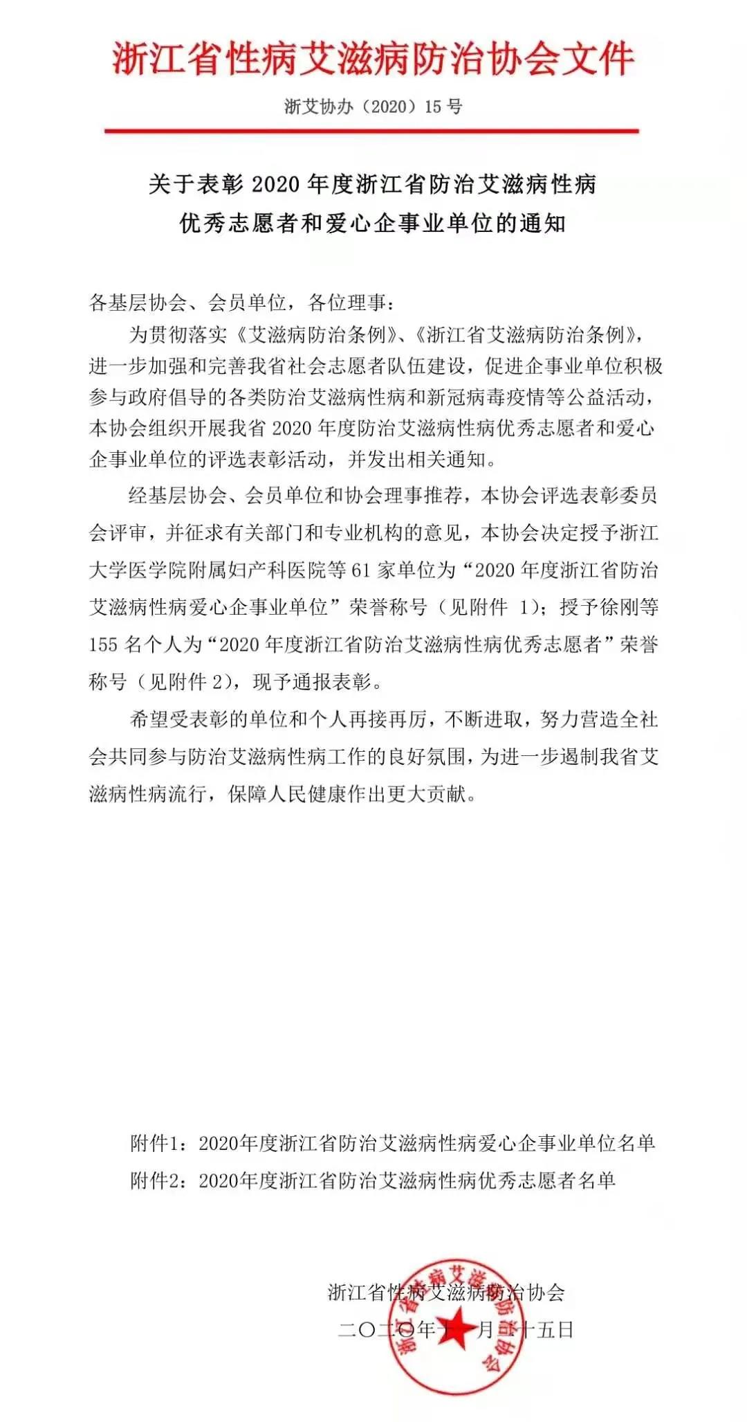 据悉,此次评选表彰由基层协会、会员单位和协会理事推荐,浙江省性病艾滋病防治协会评选表彰委员会评审,并征求有关部门和专业机构的意见,共授予61家单位为�2020年度浙江省防治艾滋病性病爱心企事业单位”荣誉称号;授予155名个人为�2020年度浙江省防治艾滋病性病优秀志愿者”荣誉称号�