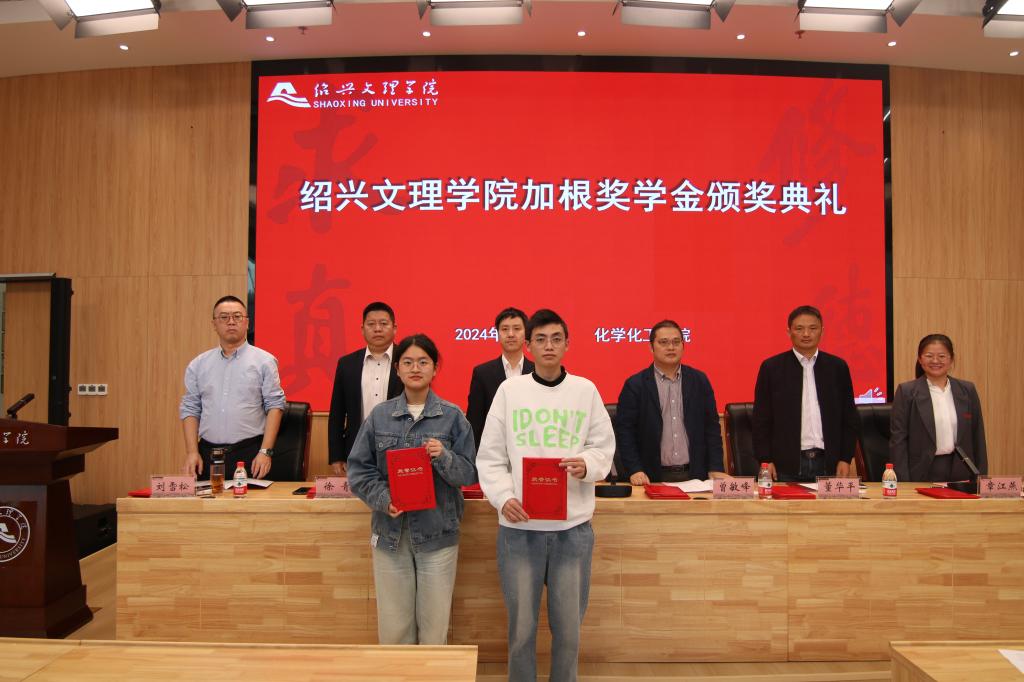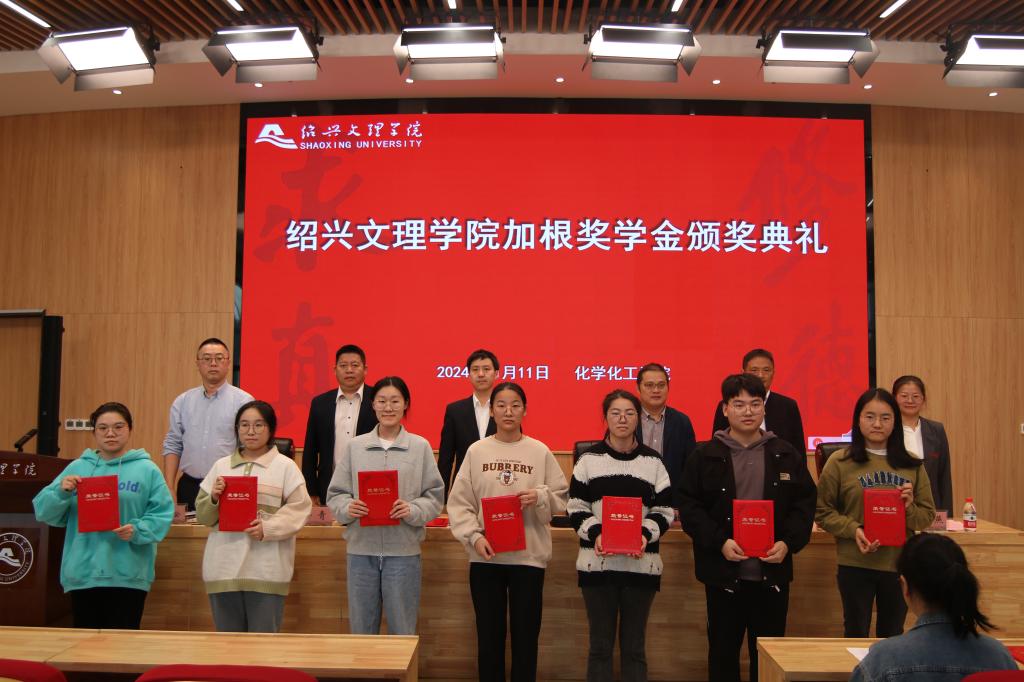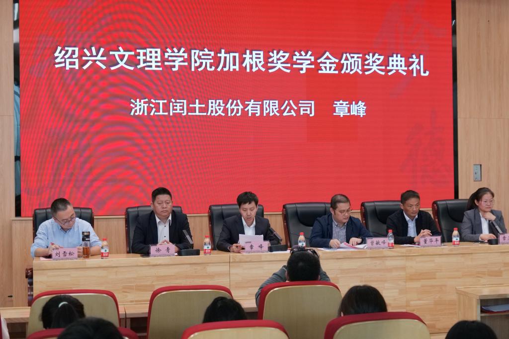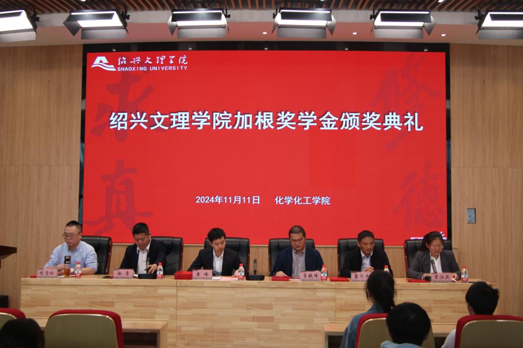 11�11日下午,绍兴文理学院�加根奖学��颁奖典礼在风则江大讲�107隆重举行。浙江闰土股份有限公司综合办副主任章峰,学院执行院长曾敏峰,党委书记徐青,副院长董华平、副院长刘雪松,获奖学生以及部分师生代表参加了颁奖典礼。典礼由学院党委副书记、纪委书记章江燕主持�