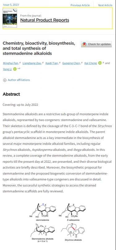 浙江省精细化学品传统工艺替代技术研究实验室郦勇课题组在药物化学和天然产物领域国际顶级权威杂志Natural Product Reports(《天然产物报告》,药理学、毒理学和药剂学排名第一,IF 15.111)发表了题为“Chemistry, bioactivity, biosynthesis, and total synthesis of stemmadenine alkaloids (Stemmadenine生物碱的化学结构、生物活性、生物合成及全合成)”的长篇综述文章。郦勇副教授是本论文通讯作者,研究生范明会是第一作者,绅士动漫